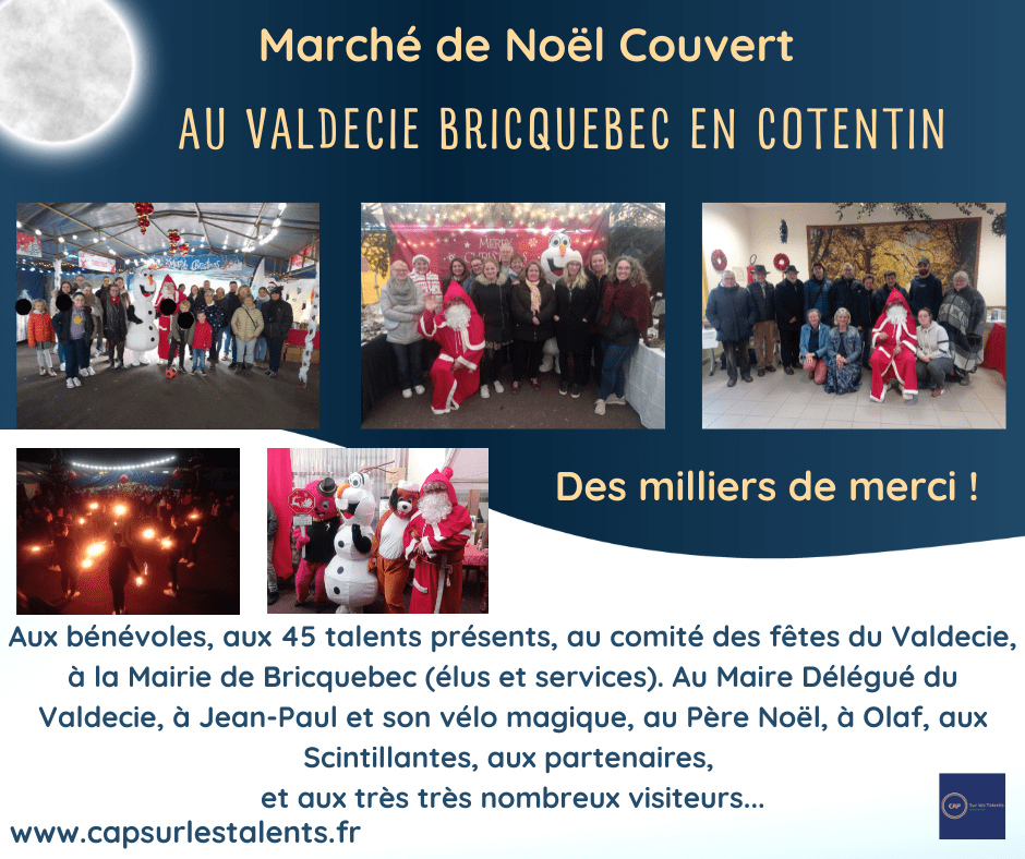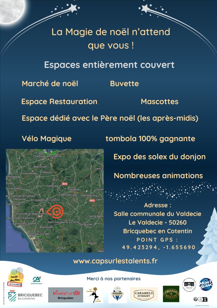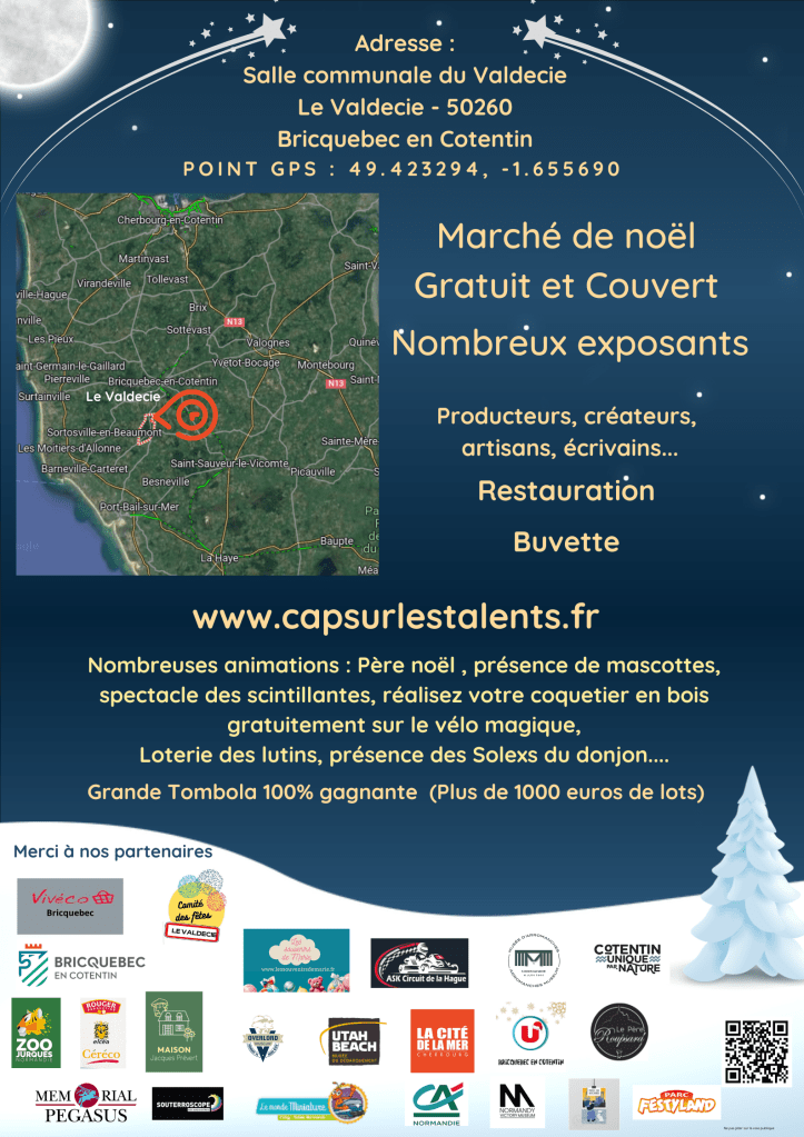 Sans oublier nos partenaires précieux pour la tombola de noël : Le cinéma du donjon (Bricquebec en Cotentin 50), La maison du biscuit (Sortosville en Beaumont 50), la Cité de la Mer(Cherbourg en Cotentin 50) , La clé des champs (Yvetot Bocage 50), Joué club (Tollevast 50), Festyland (Caen 14), le Souterroscope (Caumont sur Aure 14).